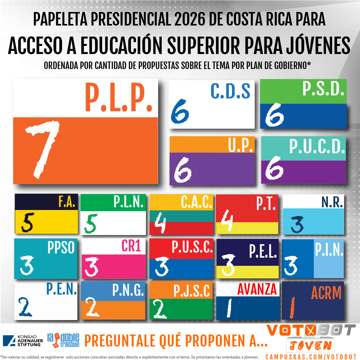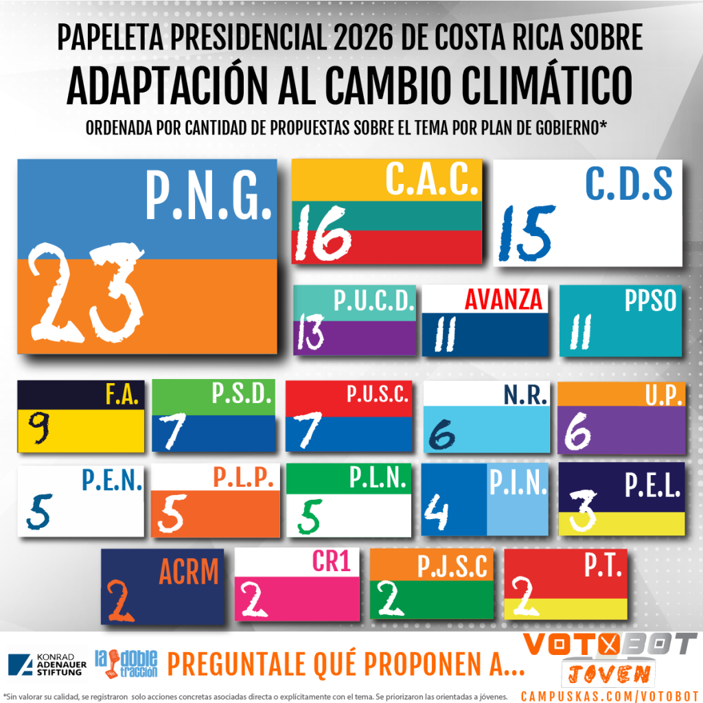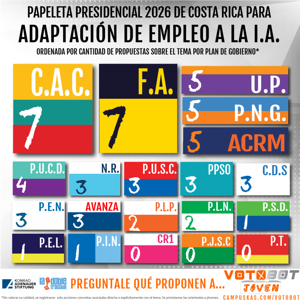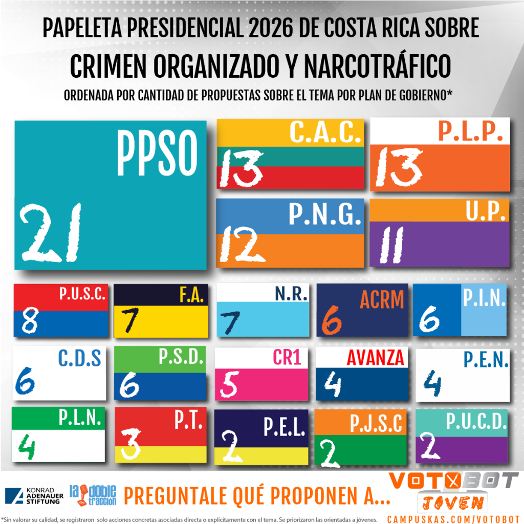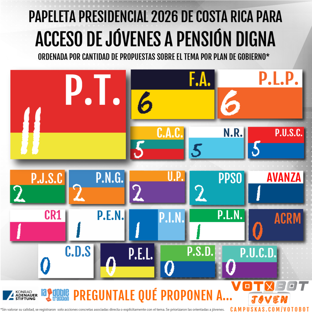 “VotoBOT Joven” es una coproducción entre la Fundación Konrad Adenauer y La Doble Tracción con el objetivo de facilitar a la ciudadanía, en especial las juventudes, el acceso y análisis vía inteligencia artificial de las 2000 páginas de planes de gobierno de las 20 candidaturas presidenciales para la elecciones de Costa Rica en 2026. Consiste de 3 componentes realizados con el apoyo de I.A.. Primero, un chatbot inteligente alimentado con todos los planes de gobierno, investigaciones del Programa Estado de la Nación sobre el contexto del país, y una base de datos llamada “Inventario Electoral” de la cantidad de propuestas de cada candidatura para 10 temas de peso para las juventudes seleccionados con base en diversas encuestas y datos abiertos. Segundo, un álbum de micropodcasts generados con I.A. que resumen cada plan de gobierno en alrededor de 15 minutos. Tercero, una serie de infografías que ilustran los resultados por tema del “Inventario Electoral”. Todos los elementos de I.A. fueron programados para no emitir ninguna opinión ni criterio sobre las candidaturas, sino meramente reportar lo que dicen las fuentes para que cada usuari@ saque sus conclusiones. Al ser una tecnología experimental y en maduración siempre se debe verificar su información con las fuentes originales y está susceptible a errores. Cualquier opinión o criterio emitido por error no refleja las posturas de ninguna de las partes coproductoras de este proyecto sino un error involuntario.