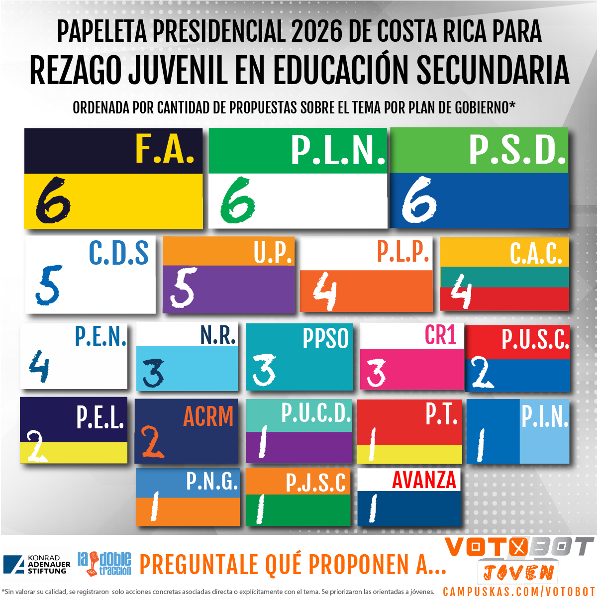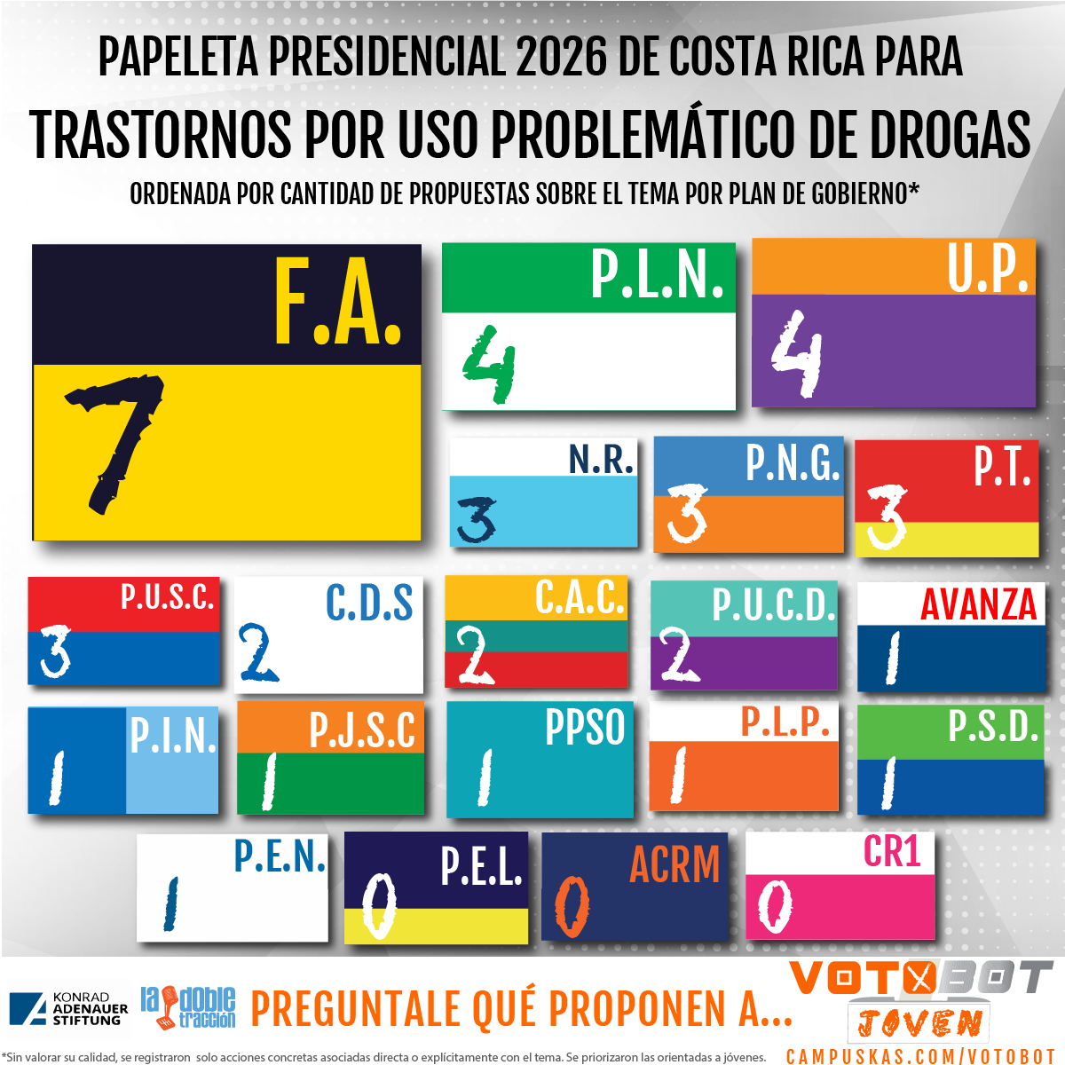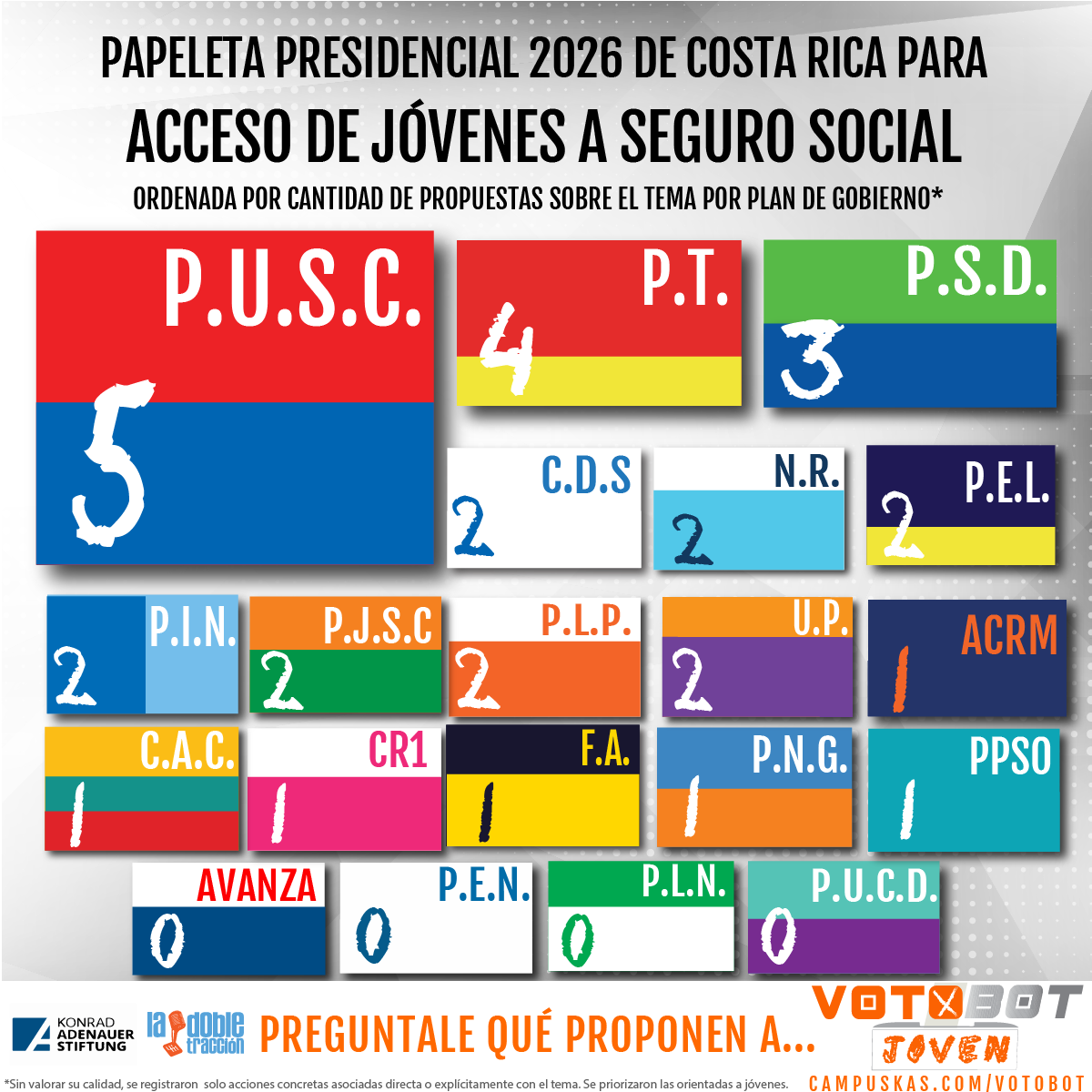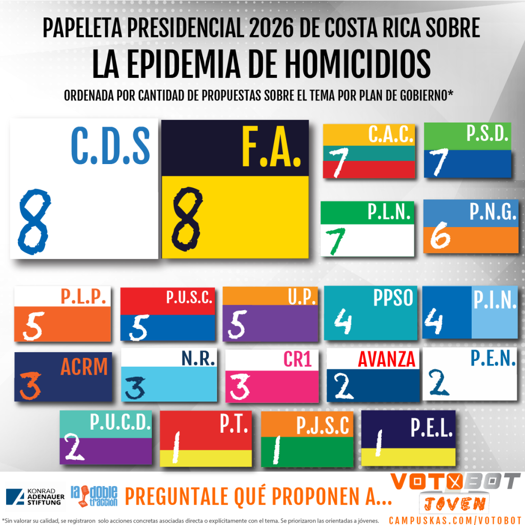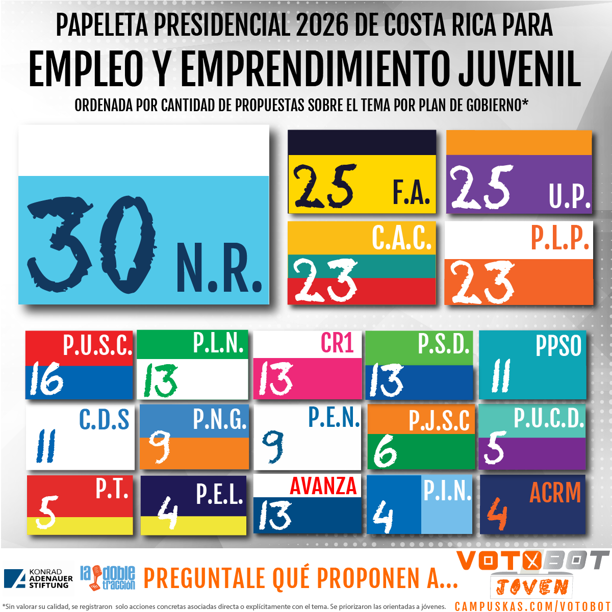 “VotoBOT Joven” es una coproducción entre la Fundación Konrad Adenauer y La Doble Tracción con el objetivo de facilitar a la ciudadanía, en especial las juventudes, el acceso y análisis vía inteligencia artificial de las 2000 páginas de planes de gobierno de las 20 candidaturas presidenciales para la elecciones de Costa Rica en 2026. Consiste de 3 componentes realizados con el apoyo de I.A.. Primero, un chatbot inteligente alimentado con todos los planes de gobierno, investigaciones del Programa Estado de la Nación sobre el contexto del país, y una base de datos llamada “Inventario Electoral” de la cantidad de propuestas de cada candidatura para 10 temas de peso para las juventudes seleccionados con base en diversas encuestas y datos abiertos. Segundo, un álbum de micropodcasts generados con I.A. que resumen cada plan de gobierno en alrededor de 15 minutos. Tercero, una serie de infografías que ilustran los resultados por tema del “Inventario Electoral”. Todos los elementos de I.A. fueron programados para no emitir ninguna opinión ni criterio sobre las candidaturas, sino meramente reportar lo que dicen las fuentes para que cada usuari@ saque sus conclusiones. Al ser una tecnología experimental y en maduración siempre se debe verificar su información con las fuentes originales y está susceptible a errores. Cualquier opinión o criterio emitido por error no refleja las posturas de ninguna de las partes coproductoras de este proyecto sino un error involuntario.